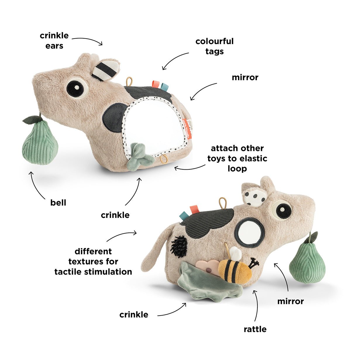 Explore, joue et apprends ! Le Activity miroir de sol Dotti est conçu pour stimuler les bébés pendant l'heure du ventre et les premiers moments de découverte. La forme douce et stable garantit que le miroir reste bien en place, tandis que le design sympathique de Dotti invite ton petit à regarder, à attraper et à bouger.