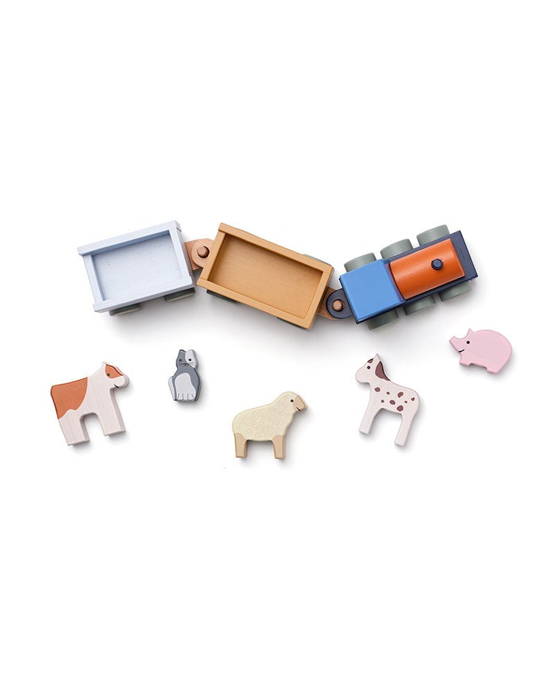 Tout le monde à bord du train de la ferme ! Ce train en bois comporte deux wagons conçus pour transporter cinq animaux de la ferme : Mira la vache, Max le cheval, Poppy le cochon, Bella le mouton et Sture le chat. Les enfants peuvent charger les animaux dans les wagons et inventer leurs propres histoires tout en poussant le train. Les animaux peuvent être déplacés et placés de différentes façons, ce qui offre d'innombrables possibilités de jeu. Le train comprend également trois blocs de bois empilables pour un plaisir supplémentaire à trier, empiler et équilibrer.