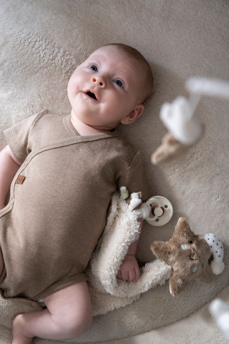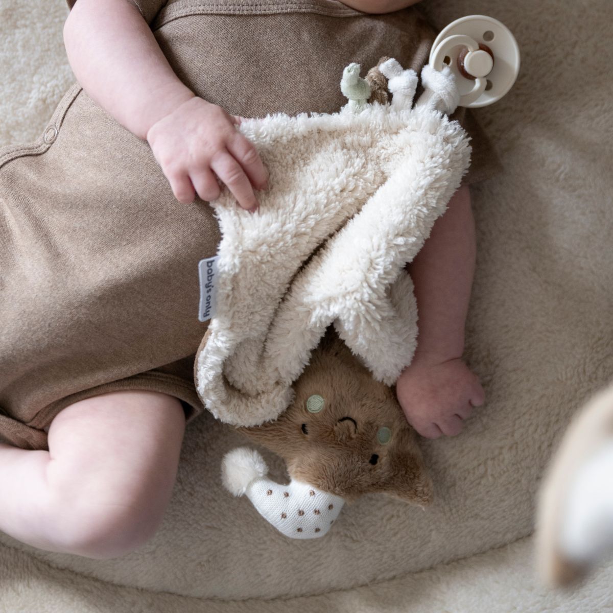 La couverture câline aux tons chauds, neutralterre et beige, est composée de différents matériaux, tels que la polaire teddy, le velours doux et le fil de polyester tricoté et brodé - parfait pour les petits explorateurs. Qu'il s'agisse du tissu doux à câliner ou des textures intéressantes à toucher et à mordiller, il y a beaucoup à découvrir. Lorsque tu appuies sur la petite étoile, tu entends un joyeux couinement, ce qui offre un plaisir de jeu supplémentaire et des petits moments de surprise.