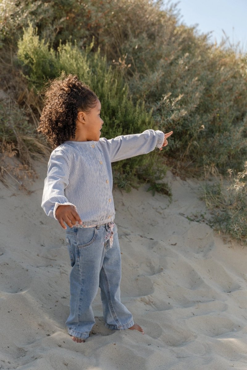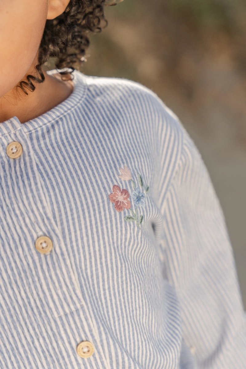 Les boutons aspect bois sur le devant facilitent l'habillage et le déshabillage. Les manches élastiques à volants apportent une touche ludique, tandis que les délicates fleurs brodées sur la poitrine ajoutent un doux détail. Le bas élastiqué assure un ajustement agréable et confortable. Fabriqué en coton biologique et certifié Oeko-Tex - pour un choix sûr et responsable, chaque jour. Un favori polyvalent pour des moments ensemble sans fin.