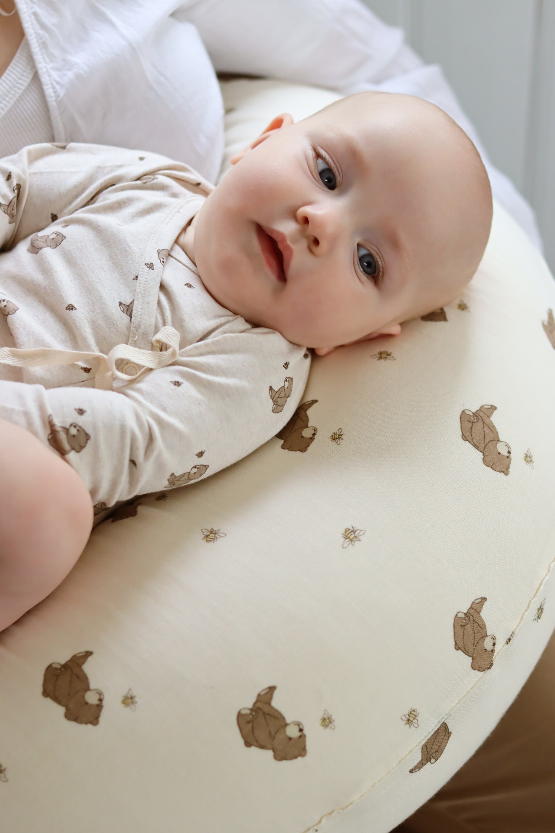 Ce magnifique oreiller d'allaitement innovant et multifonctionnel est conçu pour les futurs et nouveaux parents afin de donner le meilleur départ à un tout nouveau et incroyable chapitre. Le coussin d'allaitement répond aux besoins essentiels lors de l'allaitement au sein ou au biberon de bébé. Avec ce coussin d'allaitement pionnier, allaiter des jumeaux n'est pas un défi car la longueur est suffisante pour nourrir deux bébés. Pratique et portable, le coussin peut être facilement noué autour du corps. Il est donc particulièrement pratique pour se lever et sortir le bébé de son berceau, par exemple, pour l'allaiter. Une feuille douce est attachée à chaque extrémité du coussin d'allaitement, pour que bébé ait toujours un tissu réconfortant à portée de main. De plus, il est modelable et offre un soutien confortable à la mère et au bébé pendant l'allaitement, comme coussin de sommeil ou comme soutien lombaire pour la mère enceinte. En même temps, il sert de support parfait lorsque le bébé doit se coucher sur le ventre, de chaise ou de soutien pour le cou lorsque l'enfant grandit.