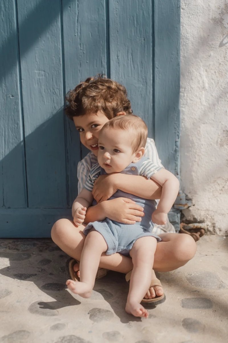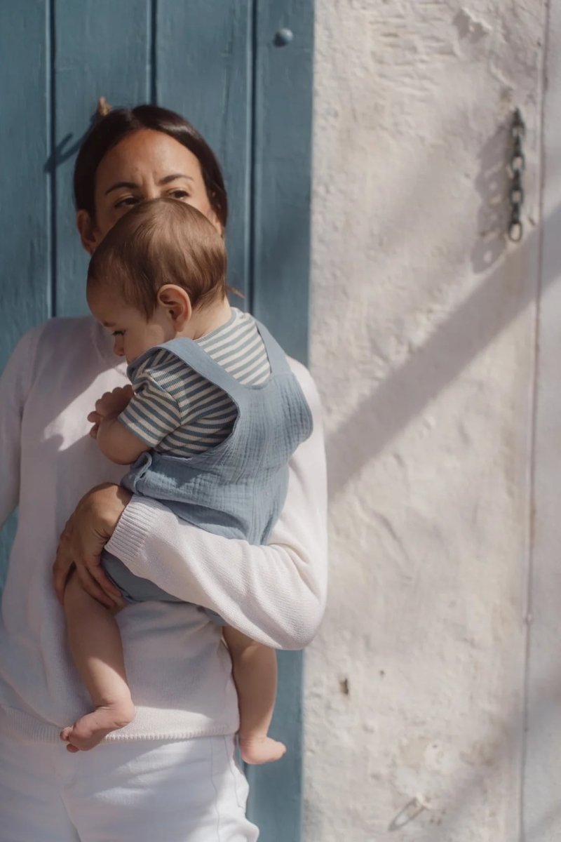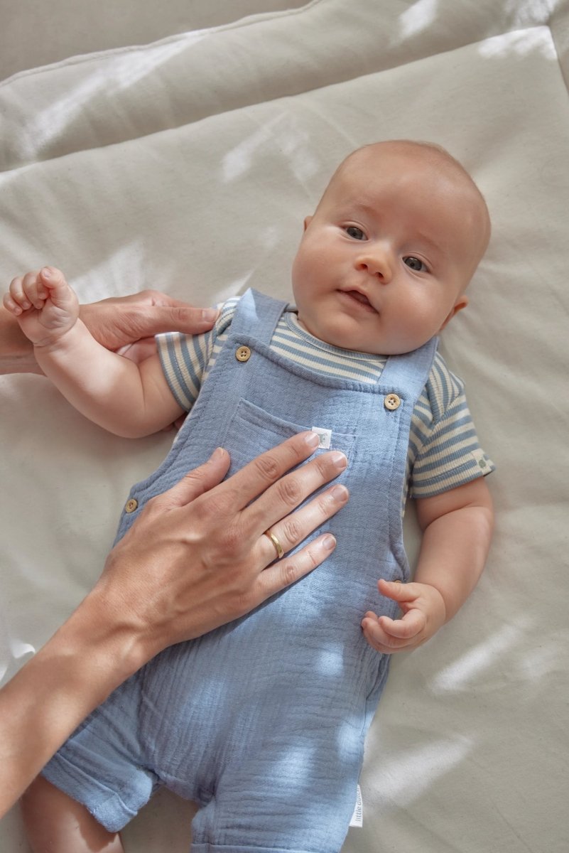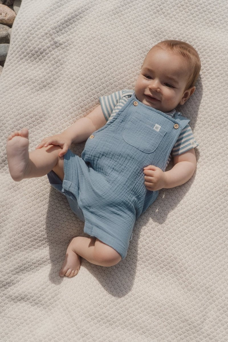 Un classique de l'été dans un nouveau look. Ce costume de jardin court en Stone Blue est fabriqué dans un tissu mousseline léger qui tombe bien et est merveilleusement confortable. Les boutons réglables aspect bois sur les épaules donnent à la combinaison de jardin un aspect naturel et assurent un bon ajustement. Les boutons-pression à l'entrejambe permettent de se changer très facilement.
