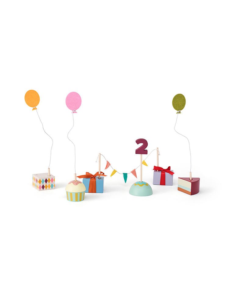 Le set se compose de cinq décorations festives en forme de cadeaux, de gâteaux et de cupcakes. Un chiffre en bois peut être placé dans chaque article pour marquer l'âge du garçon ou de la fille qui fête son anniversaire. Les chiffres inclus de 0 à 9, plus un 1 supplémentaire, permettent de réutiliser l'ensemble année après année.