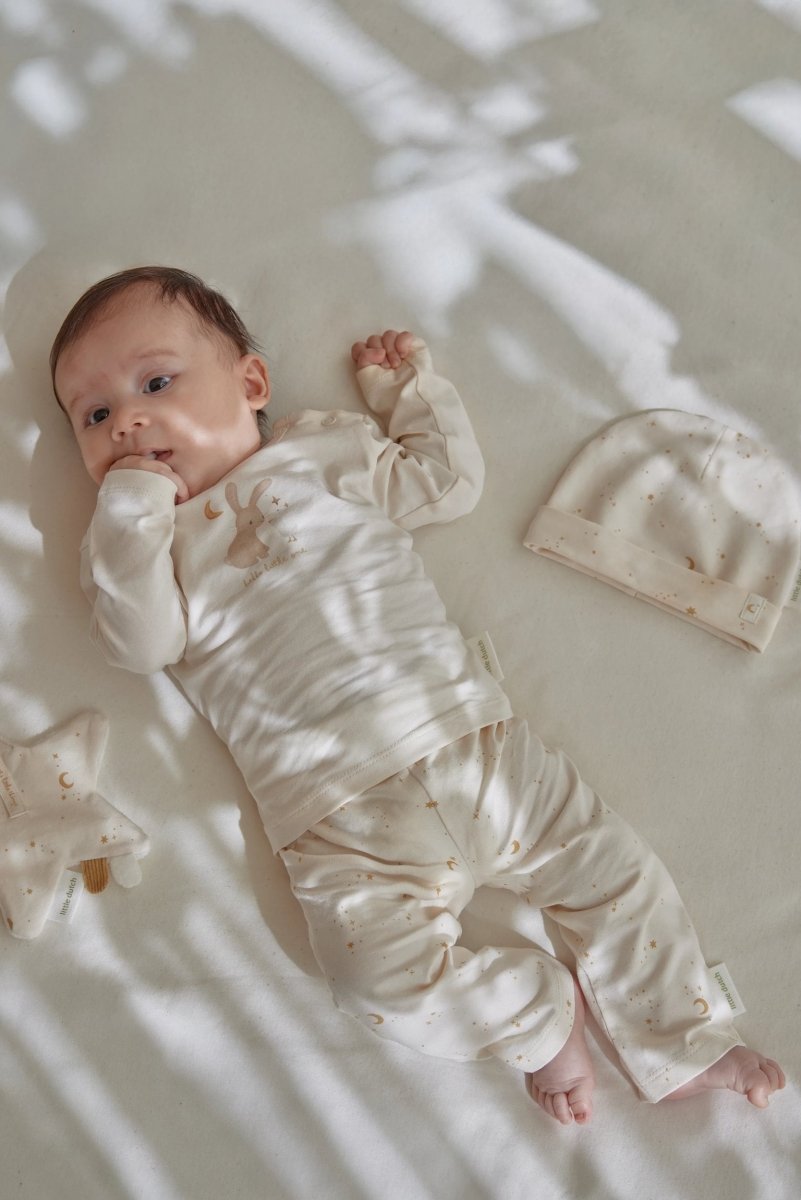 Célèbre l'arrivée d'un petit être avec cet affectueux coffret cadeau pour nouveau-né, rempli de doux essentiels pour les tout premiers moments. L'ensemble est présenté dans une magnifique boîte cadeau et comprend un adorable t-shirt imprimé Bunny & Goose, un bas confortable et un bonnet assorti au motif de rêve Moon & Stars, ainsi qu'une douce couverture câline à l'imprimé lunaire qui invite aux câlins et au repos.