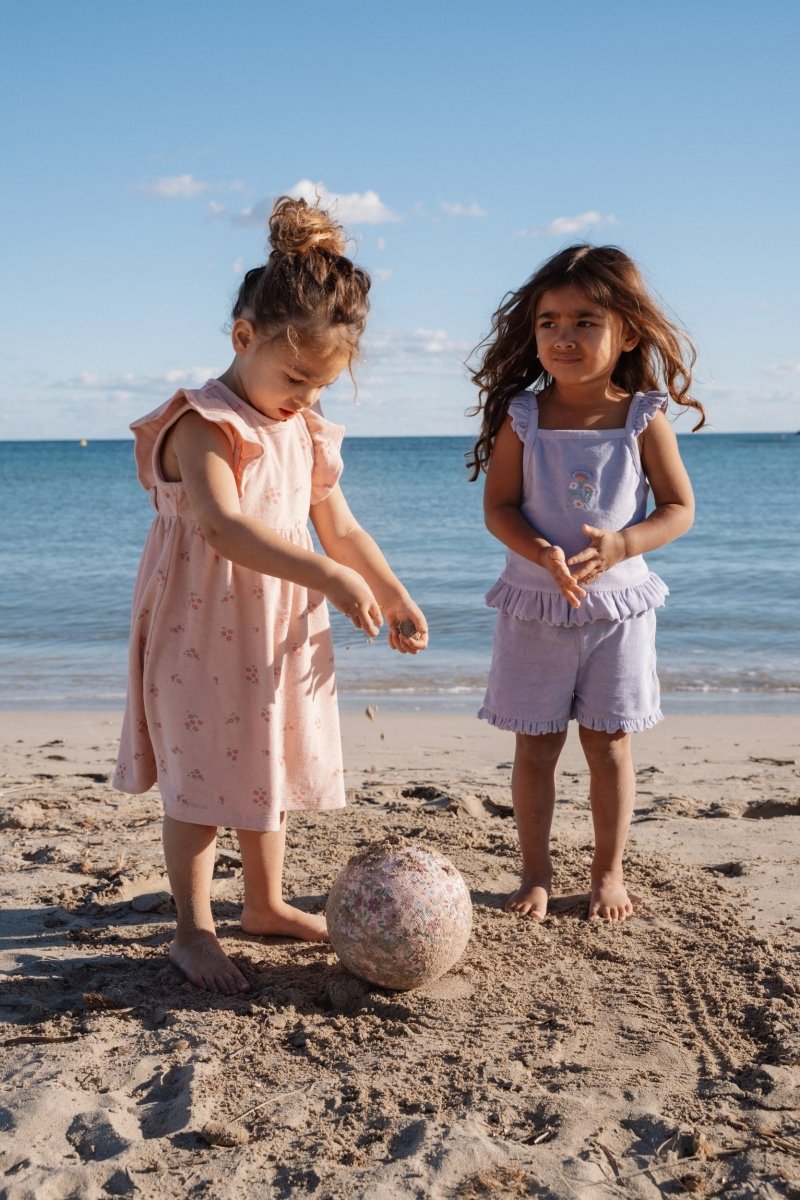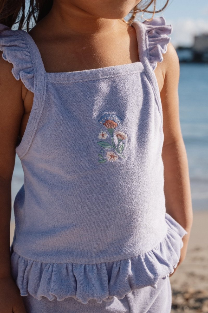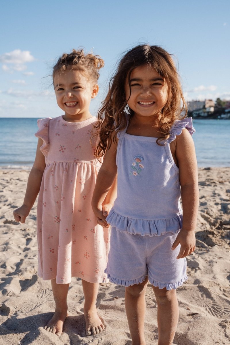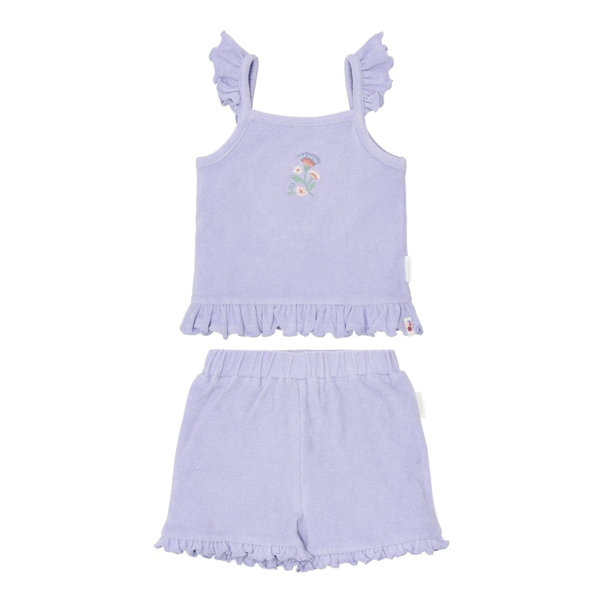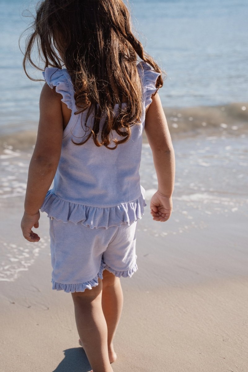 Fais rayonner ta petite puce avec cet ensemble lilas ludique et confortable, parfait pour les chaudes journées d'été pleines d'aventures. L'ensemble se compose d'un haut tout doux avec des volants sur les épaules et d'un petit short assorti avec des volants le long des jambes, ce qui le rend à la fois élégant et pratique.