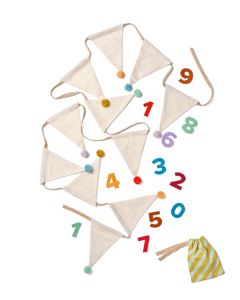 Apporte de la couleur et de la gaieté à chaque anniversaire avec cette guirlande d'anniversaire en tissu intemporel. La guirlande est fabriquée en coton doux et certifié biologique et se compose de drapeaux colorés avec des pompons joyeux aux extrémités. L'un des drapeaux est doté d'une zone velcro où tu peux attacher les chiffres (0-10) fournis - tu peux donc réutiliser la guirlande chaque année, pour tous les âges.