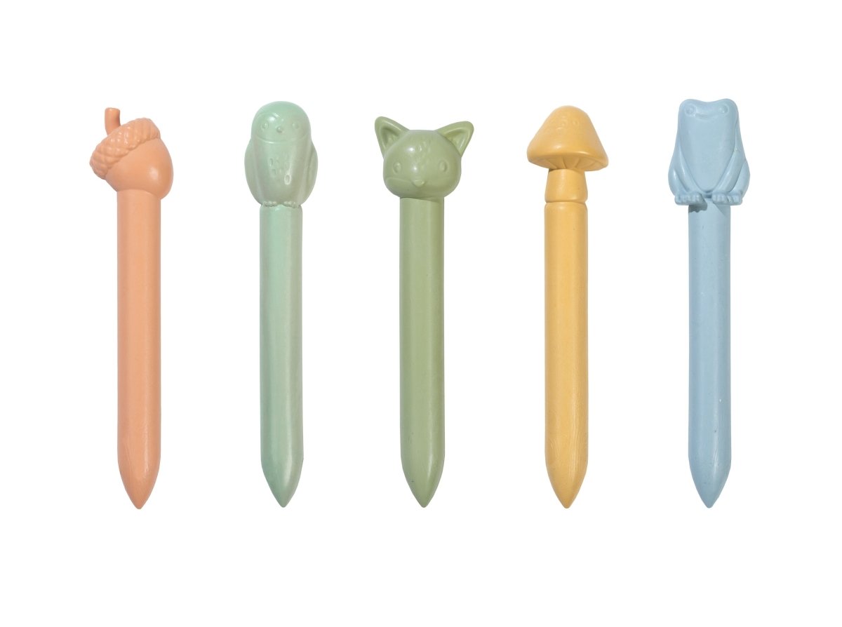 Prêt pour une aventure créative dans la forêt ? Utilise les crayons de cire Forest Friends pour dessiner sur le papier les plus belles histoires de la forêt ! Ce set contient 5 crayons de cire robustes aux couleurs naturelles, chacun avec une toupie amusante en forme de hibou, de renard, de gland, de champignon ou de grenouille. Parfait pour dessiner ainsi que pour les jeux imaginatifs. Grâce à leur format robuste, ils sont faciles à tenir par les mains des petits enfants. Pas besoin d'appuyer fort pour obtenir les plus belles couleurs sur le papier. Convient aux enfants à partir de 2 ans.
