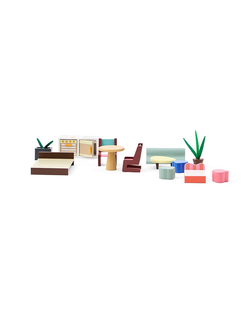 Bienvenue dans la maison d'une famille qui adore la décoration intérieure ! Cette stylisée maison de poupée en bois à trois étages suinte l'atmosphère, le confort et la créativité. Chaque pièce a son propre style, ses propres couleurs et ses propres meubles, inspirés par les voyages et les aventures autour du monde.