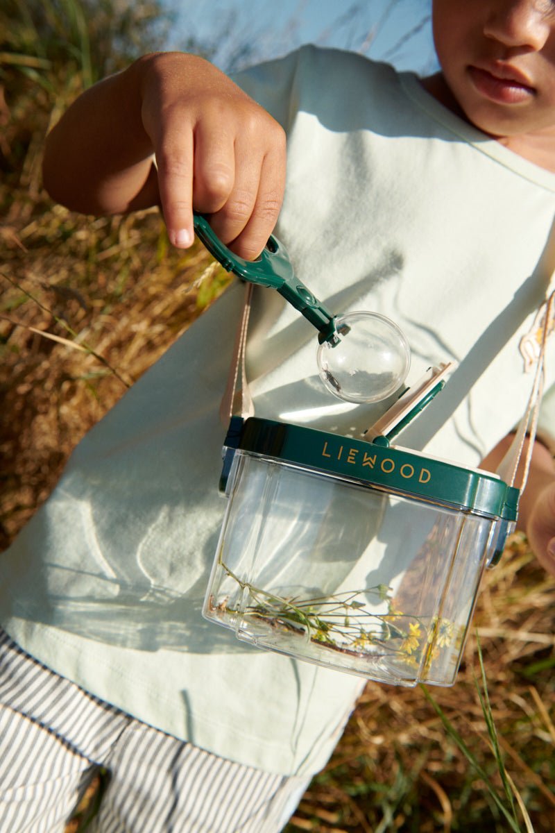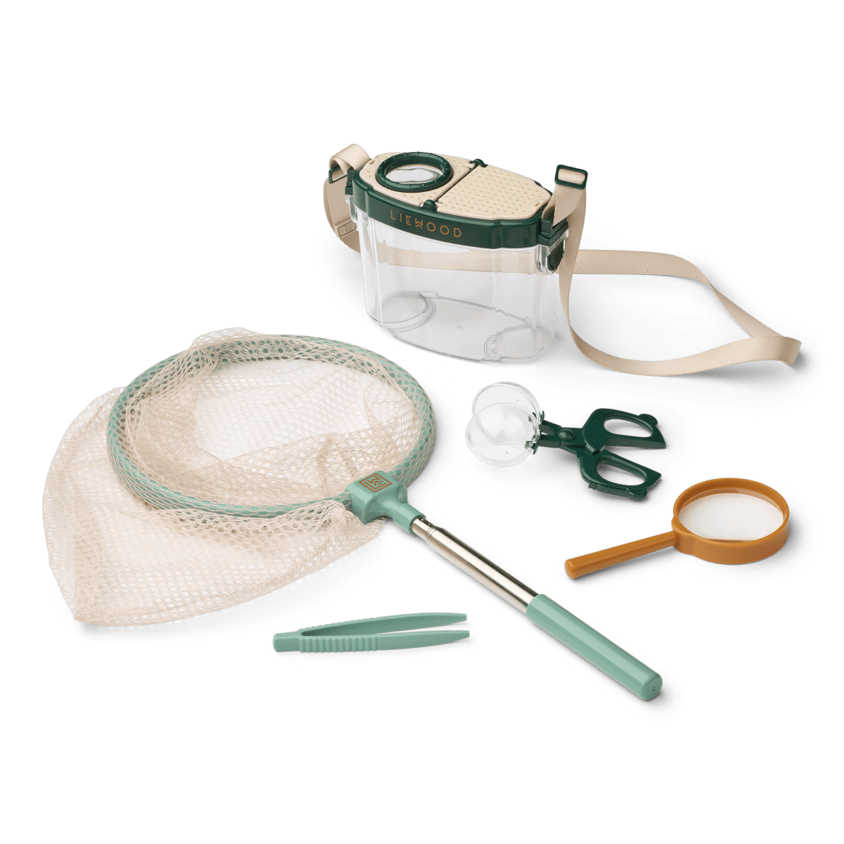 Le kit comprend : 1 loupe, 1 piège à insectes, une pince à épiler, 1 filet avec manche télescopique et 1 boîte de rangement transparente