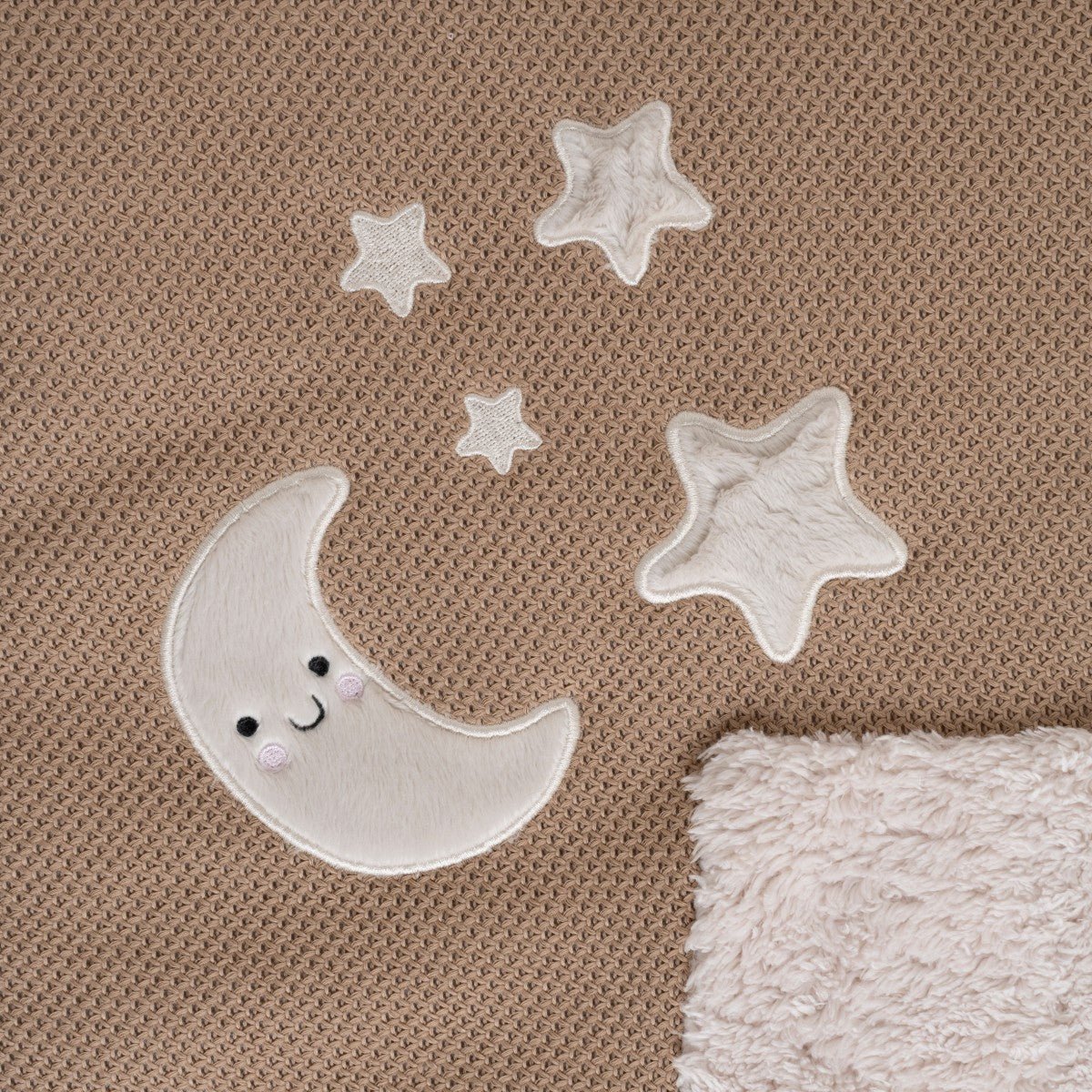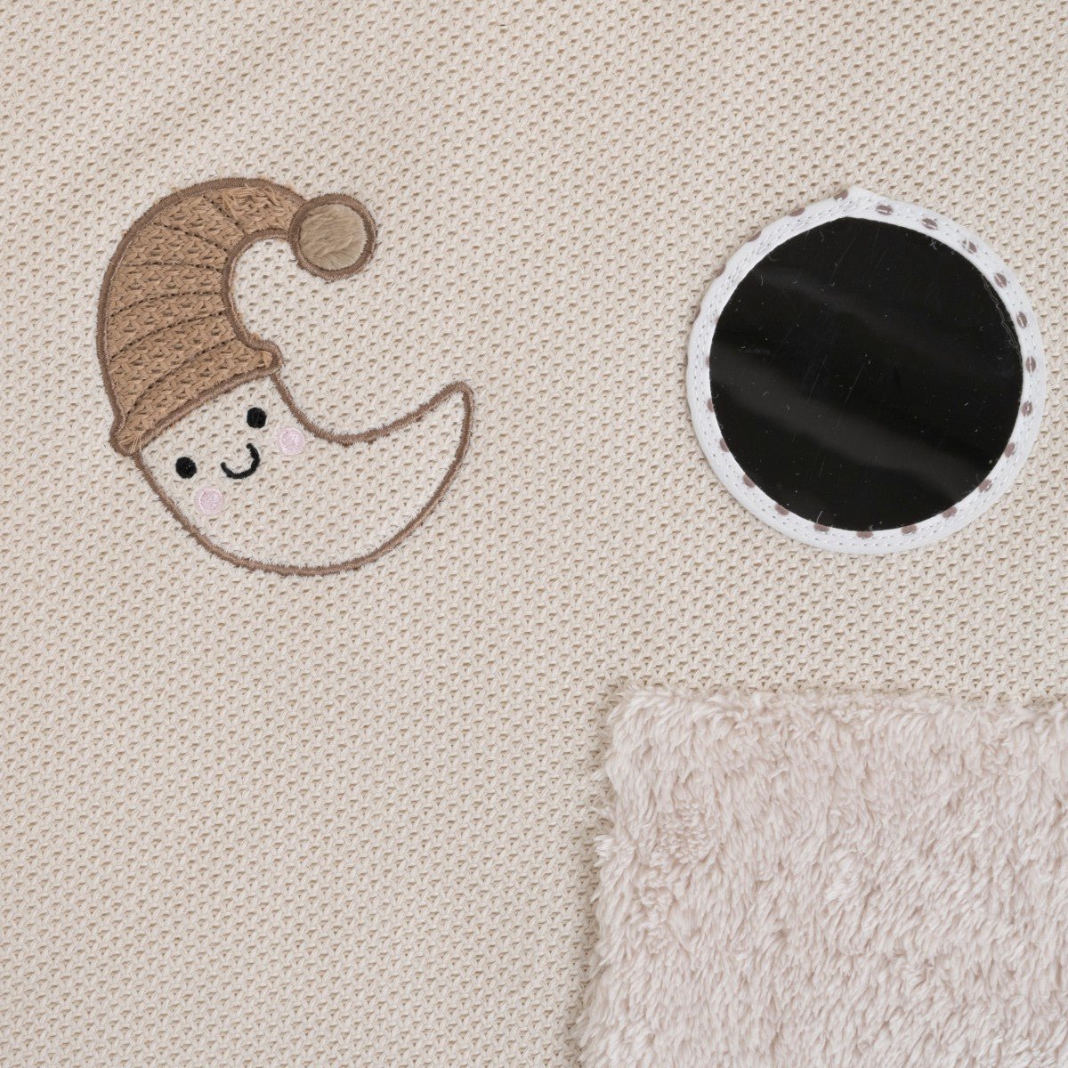 Les figures reconnaissables de lune, d'étoile et de nuage ont été subtilement et ludiquement incorporées dans le design. Elles piquent la curiosité de ton bébé et stimulent ses sens en le regardant et en le sentant. Au centre, il y a un miroir sécurisé pour bébé, qui suscite l'émerveillement et la première introduction à leur propre reflet.
