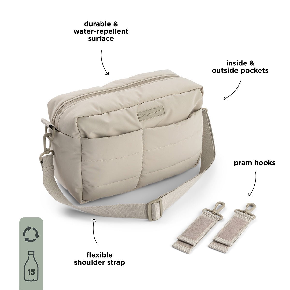 Ce sac de landau rembourré est à la fois pratique et élégant. Le sac est durable, hydrofuge et offre suffisamment d'espace de rangement pour tous les objets indispensables au quotidien. Grâce à la bandoulière flexible et aux crochets de landau inclus, tu peux facilement porter le sac ou l'attacher solidement au landau.