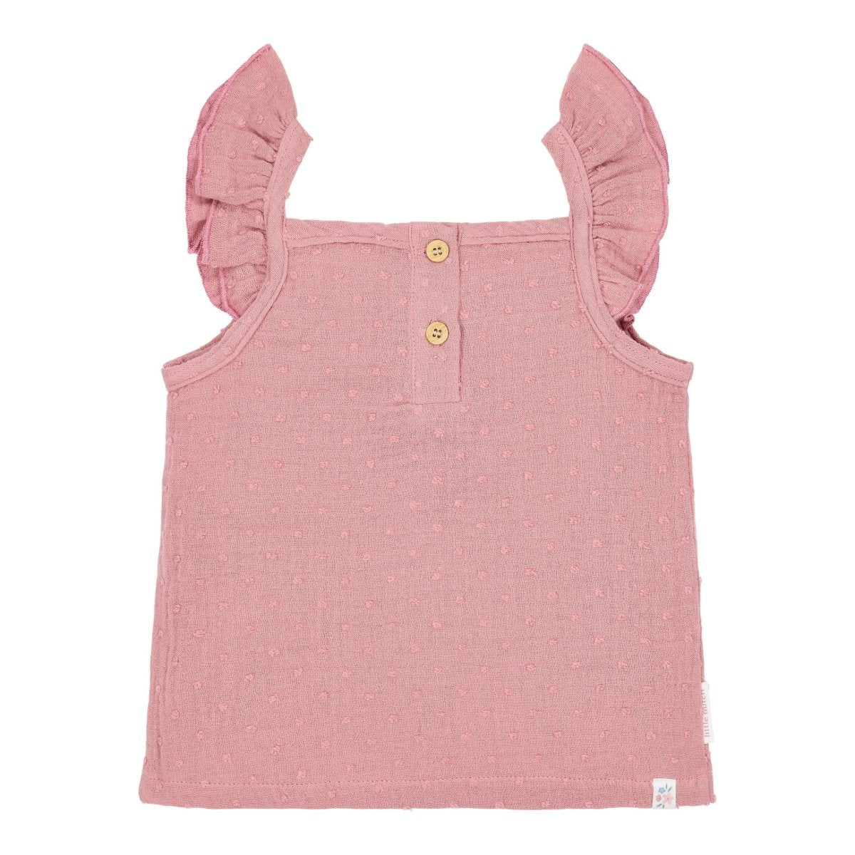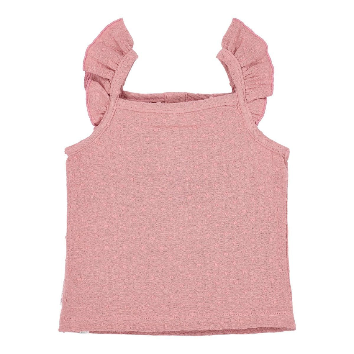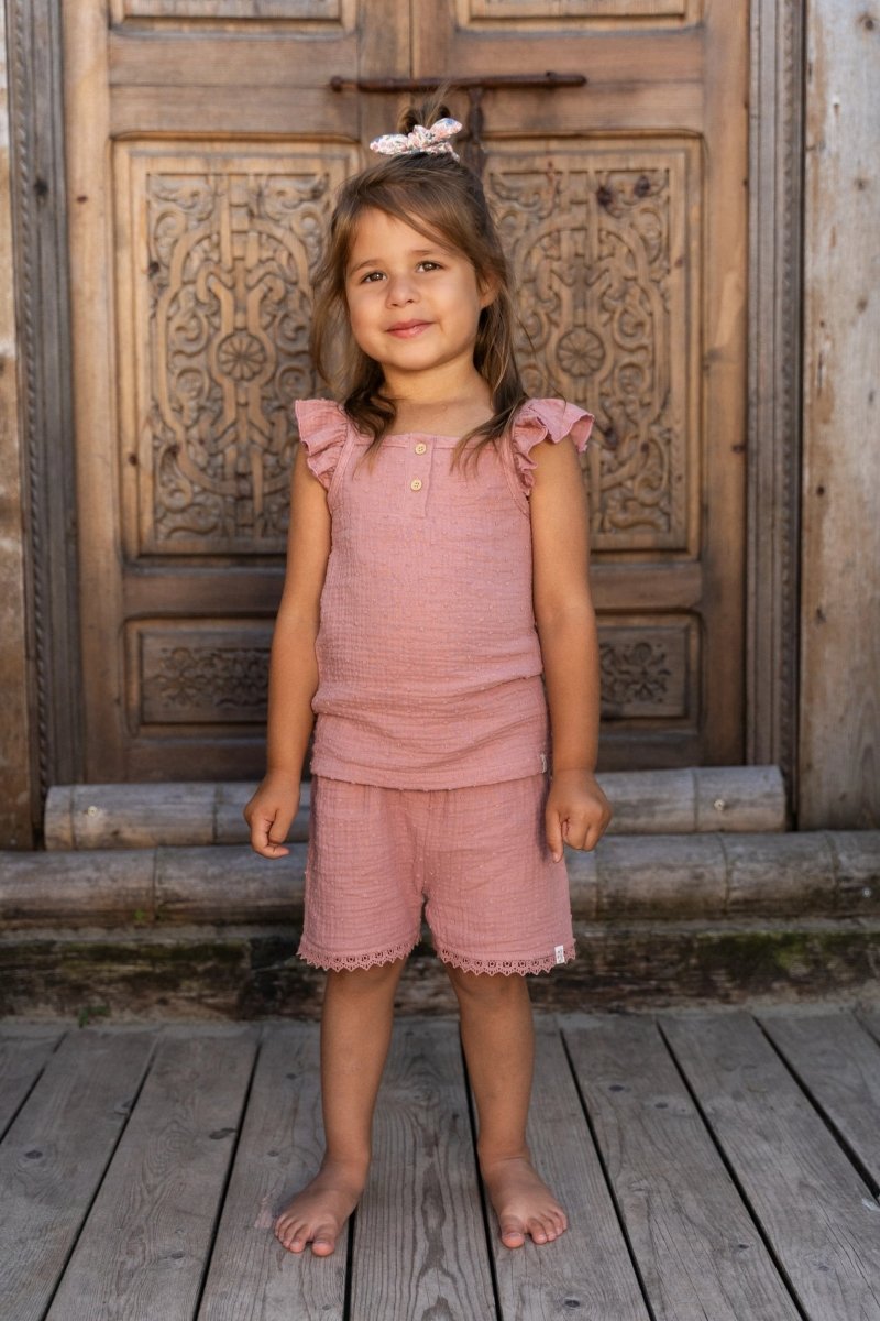 Léger, aérien et plein de détails adorables. Ce singlet en Pink Blush est fait d'un tissu fin avec un point subtil tissé dans le tissu. Les volants sur les épaules donnent au singlet un côté ludique et estival, parfait pour les journées chaudes.