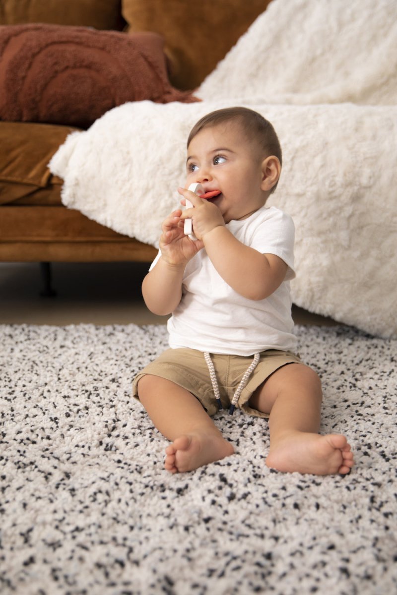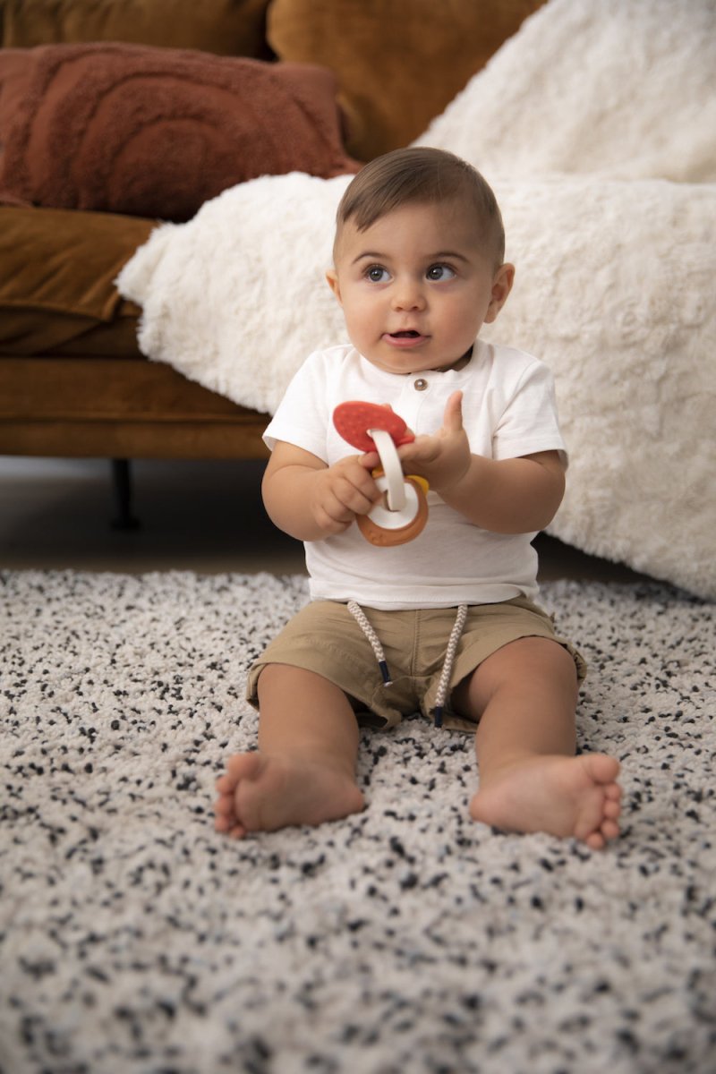 Bébé découvre et éveille son odorat avec cet amusant anneau de dentition parfumé ! L'anneau de dentition olfactif est facile à saisir et contient trois anneaux, chacun avec son propre parfum : fraise ; vanille ; noix de coco. Les parfums subtils stimulent l'odorat de bébé dès les premiers mois et éveillent sa curiosité. Convient à partir de 0 mois. Ce produit contient la certification ''OK biobased'' du laboratoire indépendant TUV Austria qui certifie l'utilisation de matières premières renouvelables (biobased). Cet anneau de dentition parfumé fait partie de la collection 5 sens. Cette collection se compose de 5 produits experts : 1 produit par sens, pour guider bébé dans les premières étapes de la découverte des sens. Élaboré en collaboration avec des spécialistes de la petite enfance. Cette collection de jouets est adaptée aux premiers stades du développement sensoriel, intuitif et évolutif de l'enfant, de la naissance à 24 mois