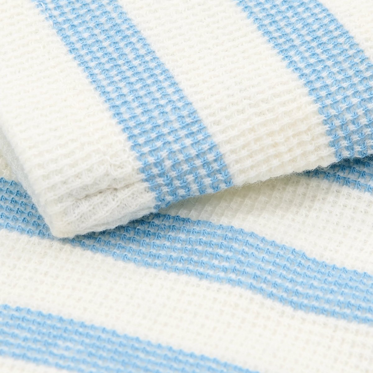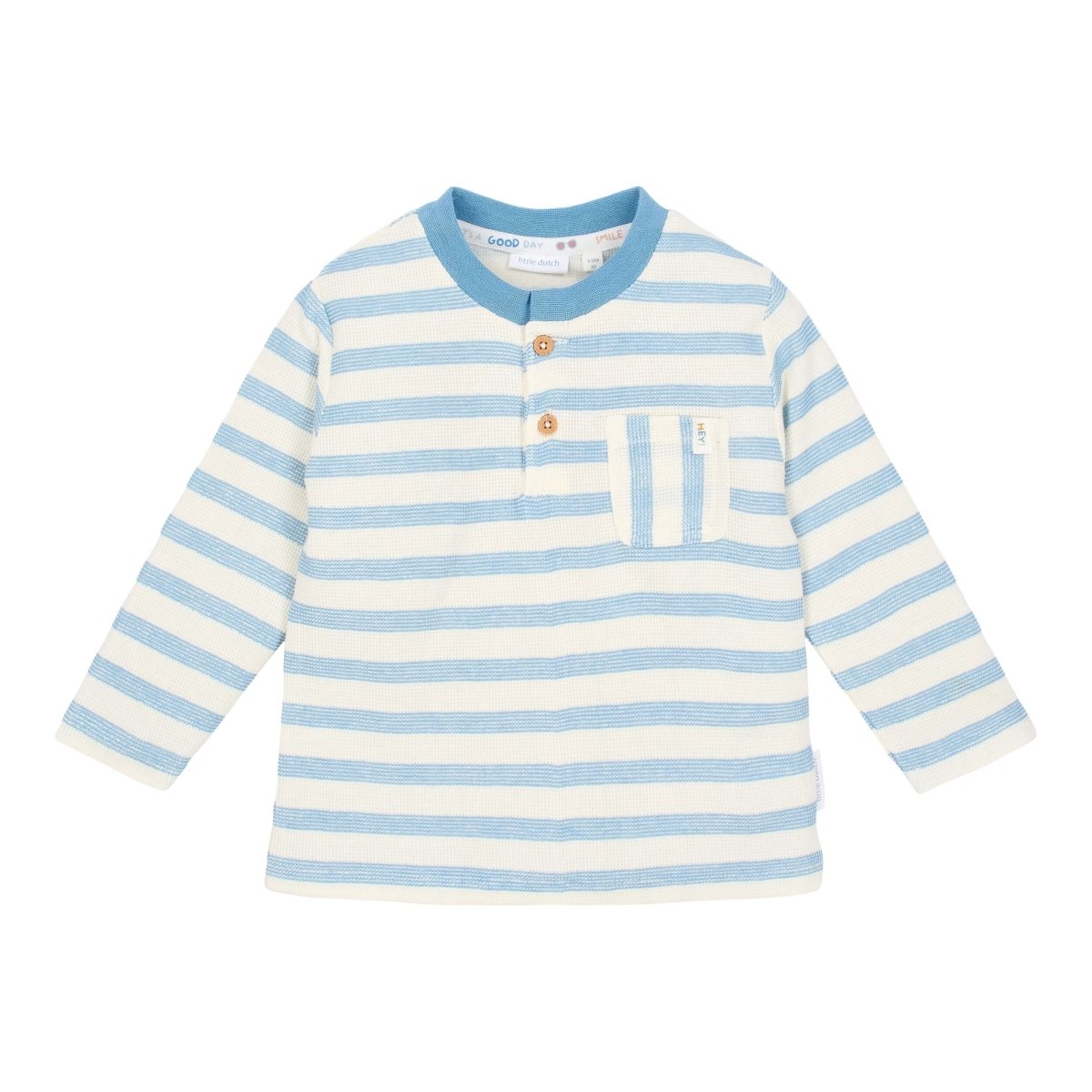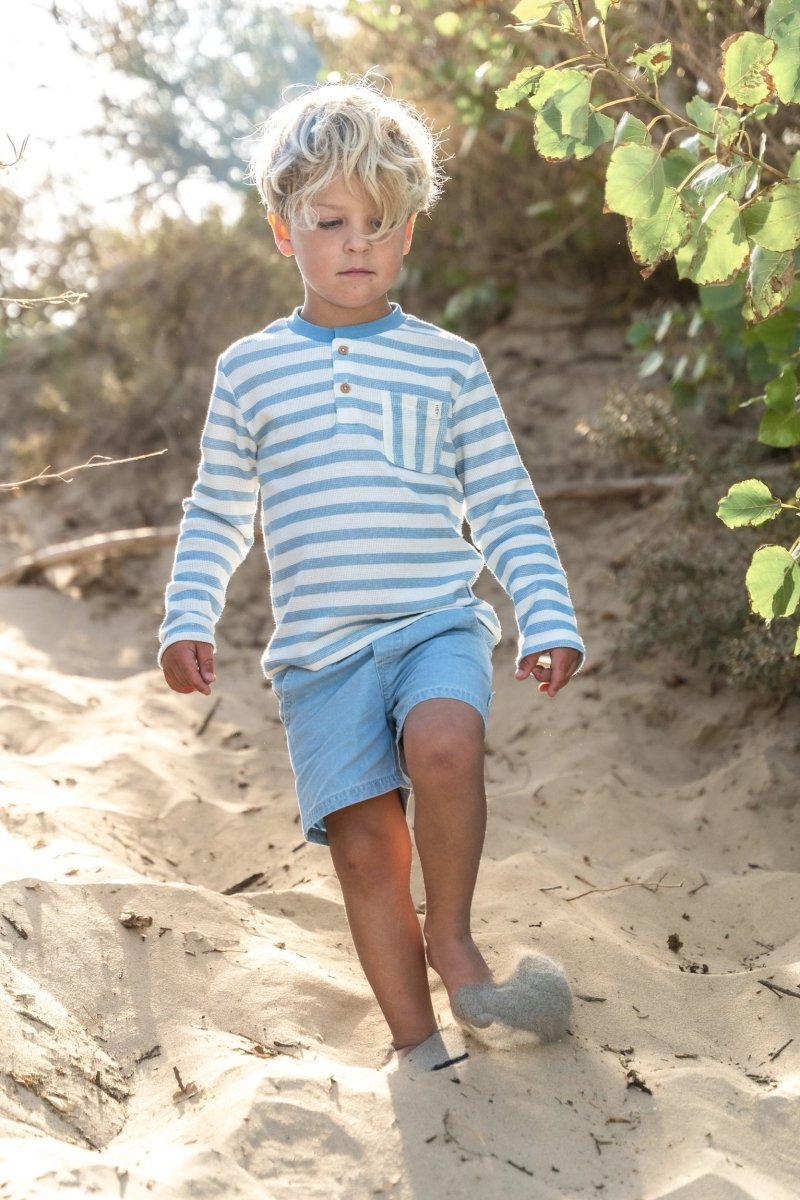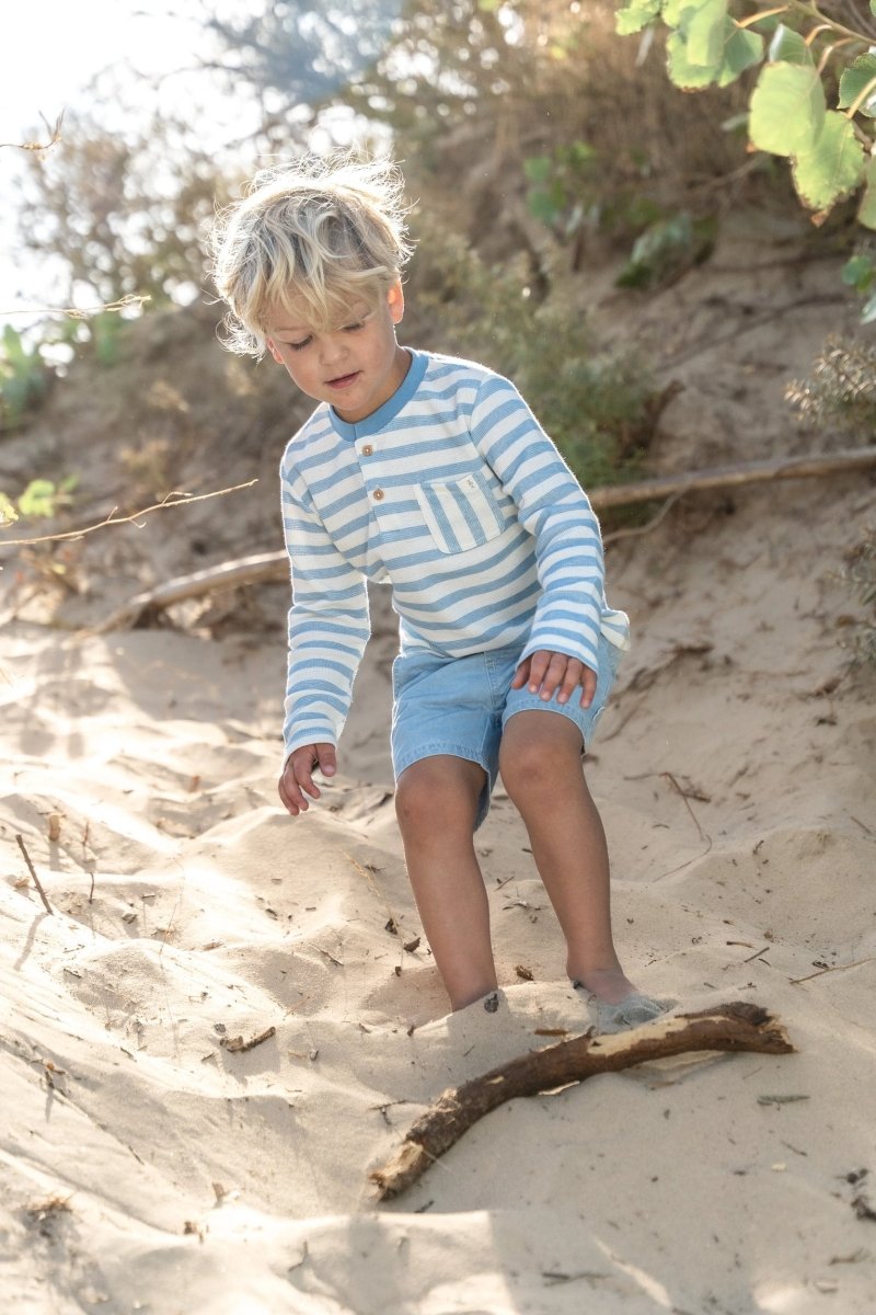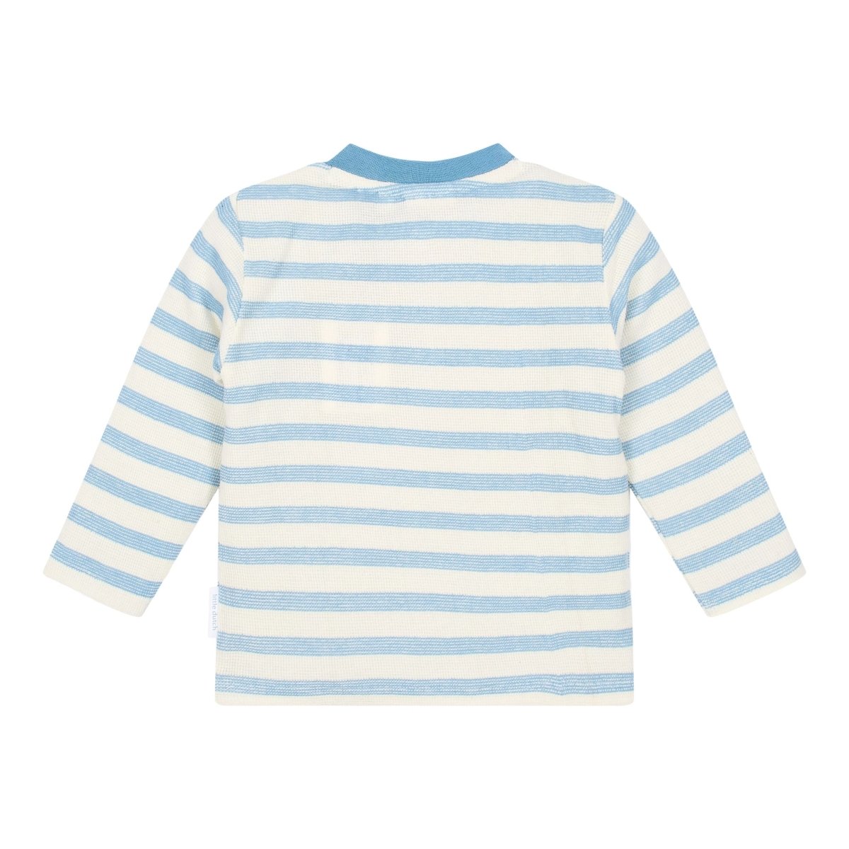 Ce t-shirt à manches longues à rayures bleu acier est un basique doux qui a du caractère. La fine texture gaufrée et les larges rayures donnent au tee-shirt une texture subtile, tandis que les boutons aspect bois à l'encolure et à la poche poitrine lui confèrent un aspect cool et naturel. Fabriqué en 100 % coton biologique et certifié Oeko-Tex, il est merveilleusement doux sur la peau et confortable pour les journées actives, même les jours de printemps plus frais.